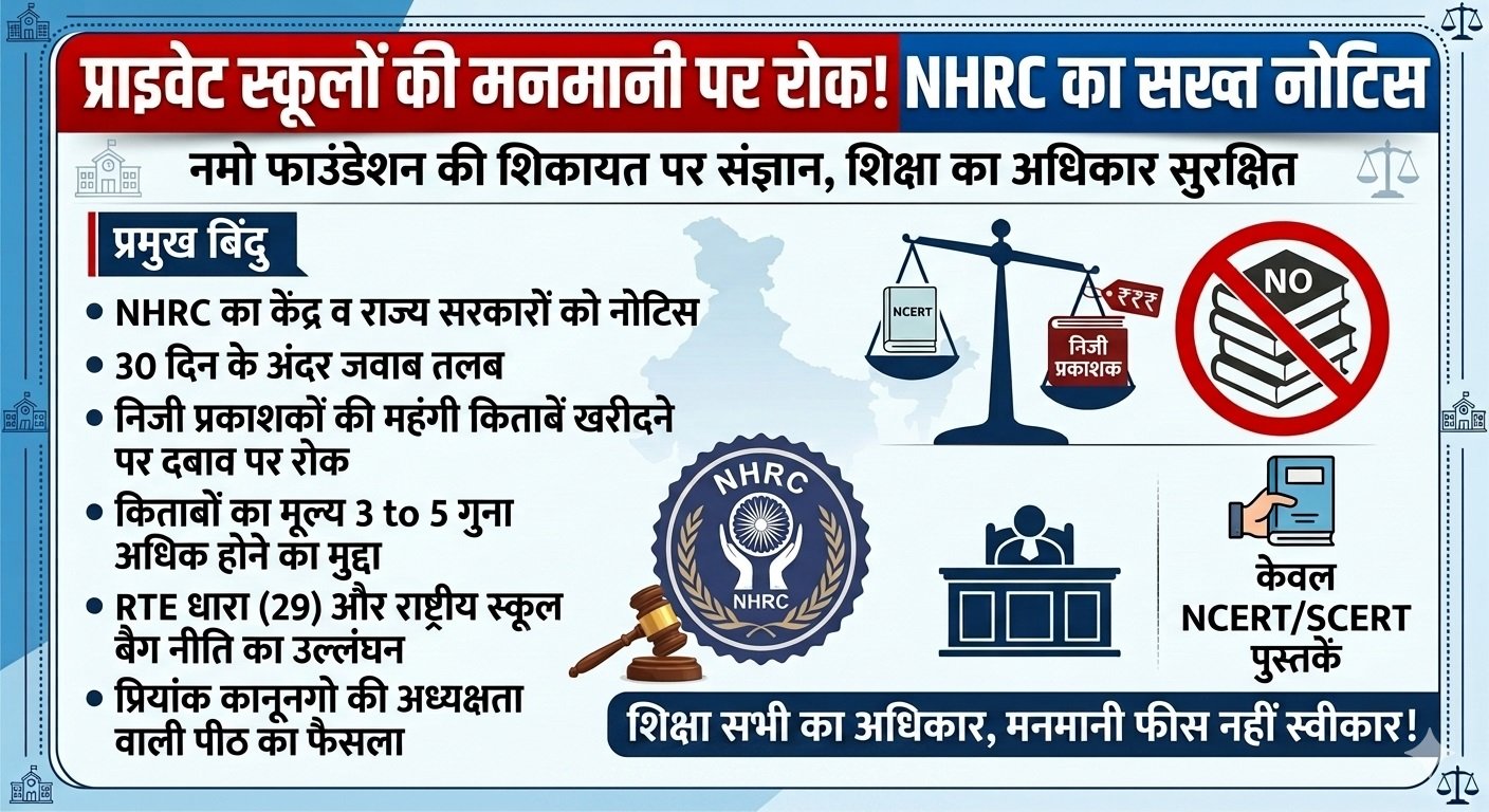 एनएचआरसी ने केंद्र और राज्य सरकारों को नोटिस जारी करते हुए कहा कि निजी स्कूल छात्रों के अभिभावकों पर निजी प्रकाशकों की पुस्तकें खरीदने का दबाव बनाते हैं। आयोग ने राज्यों और केंद्र शासित प्रदेशों को भेजे नोटिस में कहा कि राष्ट्रीय स्कूल बैग नीति और शिक्षा का अधिकार अधिनियम (आरटीई) की धारा (29) का अनुपालन सुनिश्चित किया जाए। निजी स्कूलों द्वारा अभिभावकों पर अपने खास प्रकाशकों की पुस्तकों को खरीदने का दबाव डालने के संबंध में नमो फाउंडेशन ने राष्ट्रीय मानवाधिकार आयोग को शिकायत भेजी थी। उस पर आयोग के सदस्य प्रियांक कानूनगो की अध्यक्षता वाली पीठ ने 15 अप्रैल को सुनवाई की थी। इस शिकायत में राष्ट्रीय मानवाधिकार आयोग को बताया गया था कि सीबीएसई, आईसीएसई समेत अन्य बोर्डोँ से संबद्ध निजी स्कूल और कॉलेज एनसीईआरटी और एससीईआरटी की पुस्तकों को पढ़ाने की जगह निजी प्रकाशकों की महंगी किताबें खरीदने का दबाव बनाते हैं। यह आरटीई की धारा (29) का उल्लंघन है। निजी स्कूलों की इस मनमानी से अभिभावकों पर अनावश्यक बोझ बढ़ता है। इसके साथ ही सबको समान शिक्षा देने की नीति भी प्रभावित होती है। शिकायत में बताया गया था कि अभिभावकों से मजबूरी में खरीदवाई जाने वाली निजी स्कूलों में विभिन्न क्लासेज में अलग-अलग विषयों की किताबें और कापियां तुलनात्मक रुप से तीन से पांच गुनी महंगी होती है। यह राष्ट्रीय स्कूल बैग नीति का भी खुला उल्लंघन है। केंद्र सरकार ने साल 2020 में राष्ट्रीय स्कूल बैग नीति बनाई थी, जिसमें बच्चों का बैग हल्का रखने की बात कही गई थी।