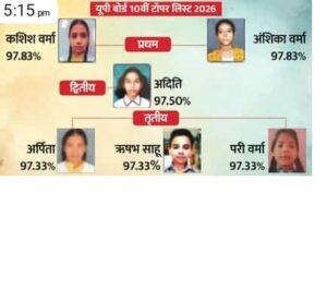 यूपी बोर्ड हाईस्कूल परीक्षा 2026 में कई छात्रों ने शानदार प्रदर्शन किया है। इस बार प्रथम स्थान पर सीतापुर की कशिश वर्मा और बाराबंकी की अनशिका वर्मा आईं। दोनों ने एक साथ 97.83% अंक प्राप्त किए। द्वितीय स्थान पर अदिति ने 97.50% अंक हासिल किए। वहीं तृतीय स्थान पर अर्पिता, ऋषभ साहू और परी वर्मा ने 97.33% अंक प्राप्त कर उत्कृष्ट प्रदर्शन किया। इन विद्यार्थियों ने बोर्ड परीक्षा में बेहतरीन सफलता हासिल कर अपने-अपने स्कूल और जिले का नाम रोशन किया है।