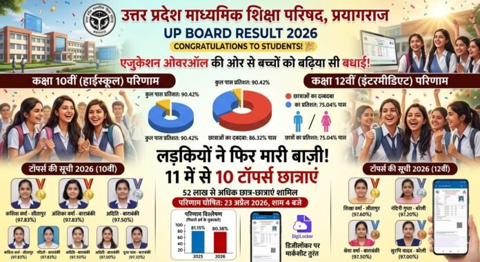 बीते शैक्षणिक सत्र में बोर्ड परीक्षा में शामिल होने वाले 52 लाख से अधिक छात्र-छात्राओं का इंतजार खत्म हुआ। यूपी बोर्ड ने 10वीं का परिणाम आज 23 अप्रैल 2026 को शाम 4 बजे घोषित कर दिया। परीक्षा परिणाम में इस बार भी लड़कियों ने बाजी मारी है। 10वीं कक्षा का रिजल्ट 90.42 जबकि 12वीं का 80.38 प्रतिशत रहा। छात्र यूपी बोर्ड (UPMSP) की आधिकारिक वेबसाइट upresults.nic.in डिजीलॉकर या एसएमएस पर जाकर अपनी मार्कशीट तुरंत चेक कर सकते हैं।